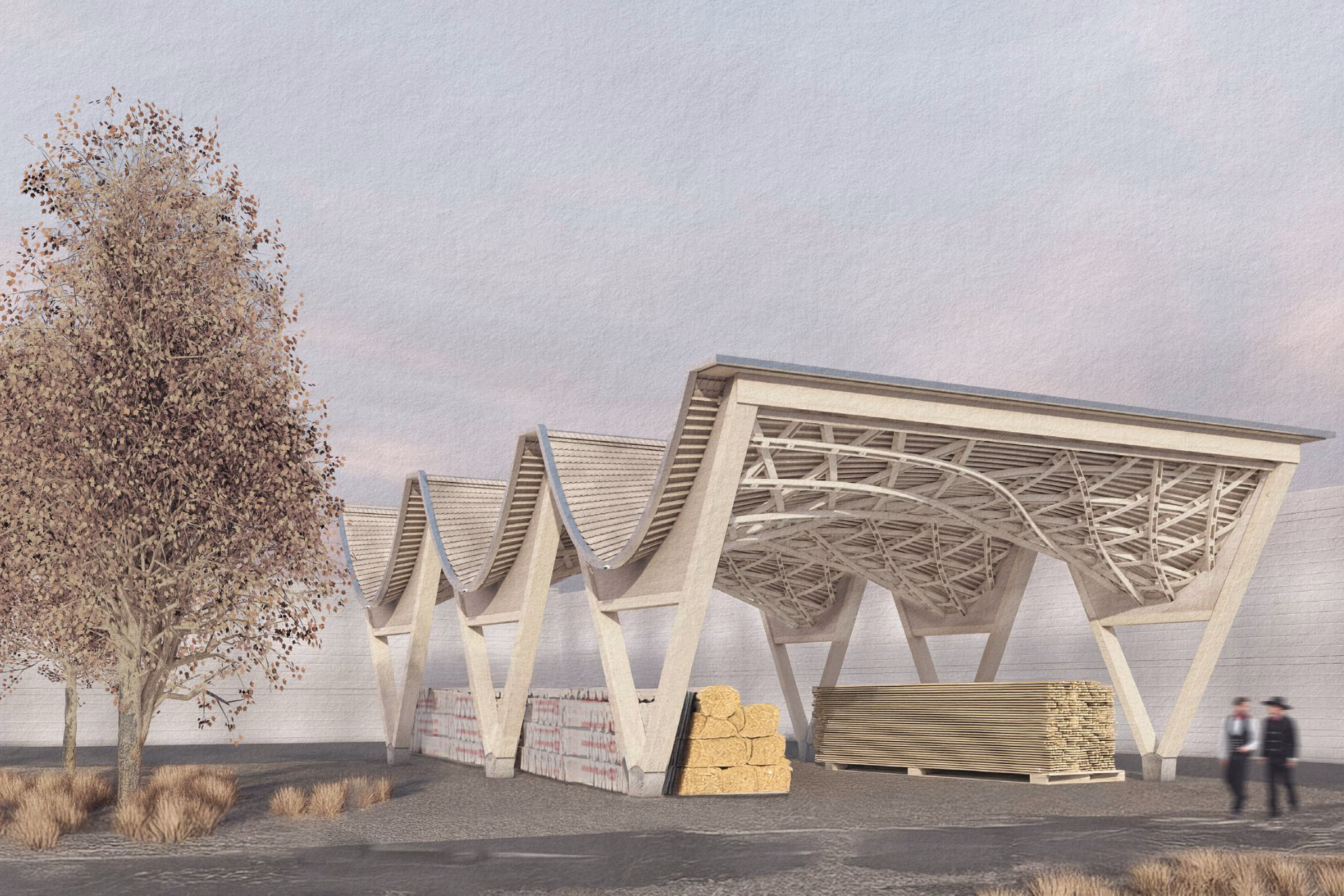 Durch das Verweben gerader, vorgefertigter Bretter entstehen effizient tragende, doppelt gekrümmte Strukturen, die sich aus der Ebene selbst in Form bringen. Das Folgeprojekt zielt auf die Marktreife, inklusive konstruktiver Details, industrieller Fertigung und integrierter Lösungen für Tragwerk und Gebäudehülle.