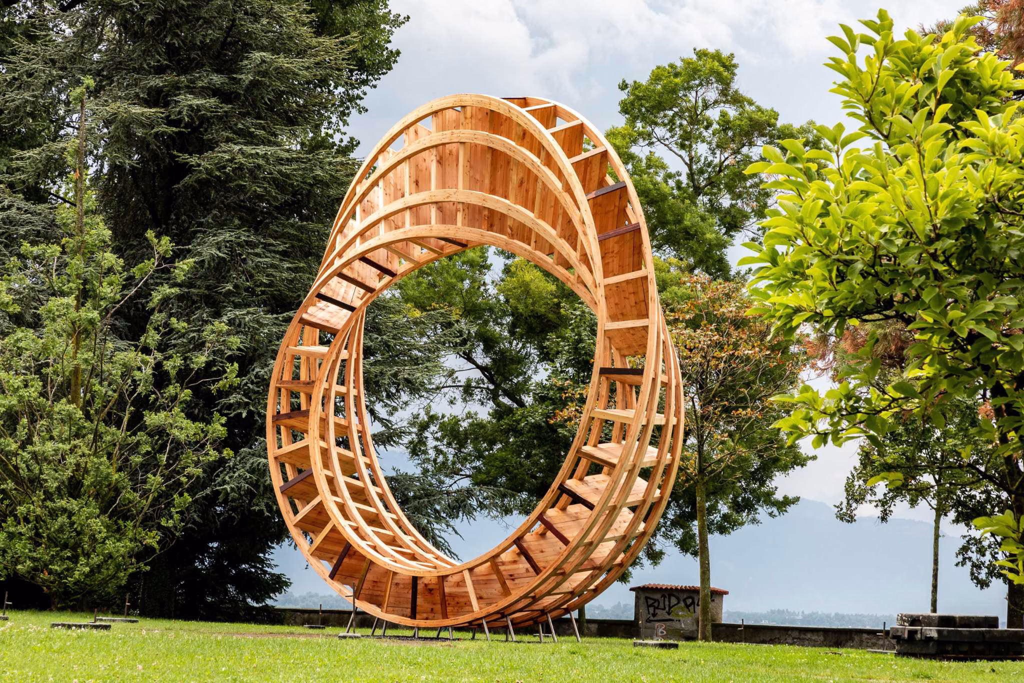 Für die zehnte Weltkonferenz von Religions for Peace in Lindau durften wir den Holzbau für die beeindruckende Möbiusband-Skulptur übernehmen. Das siebeneinhalb Meter hohe Kunstwerk aus Lärchenholz vereint 36 Holzarten aus aller Welt zu einem Symbol für Einheit und Vielfalt.